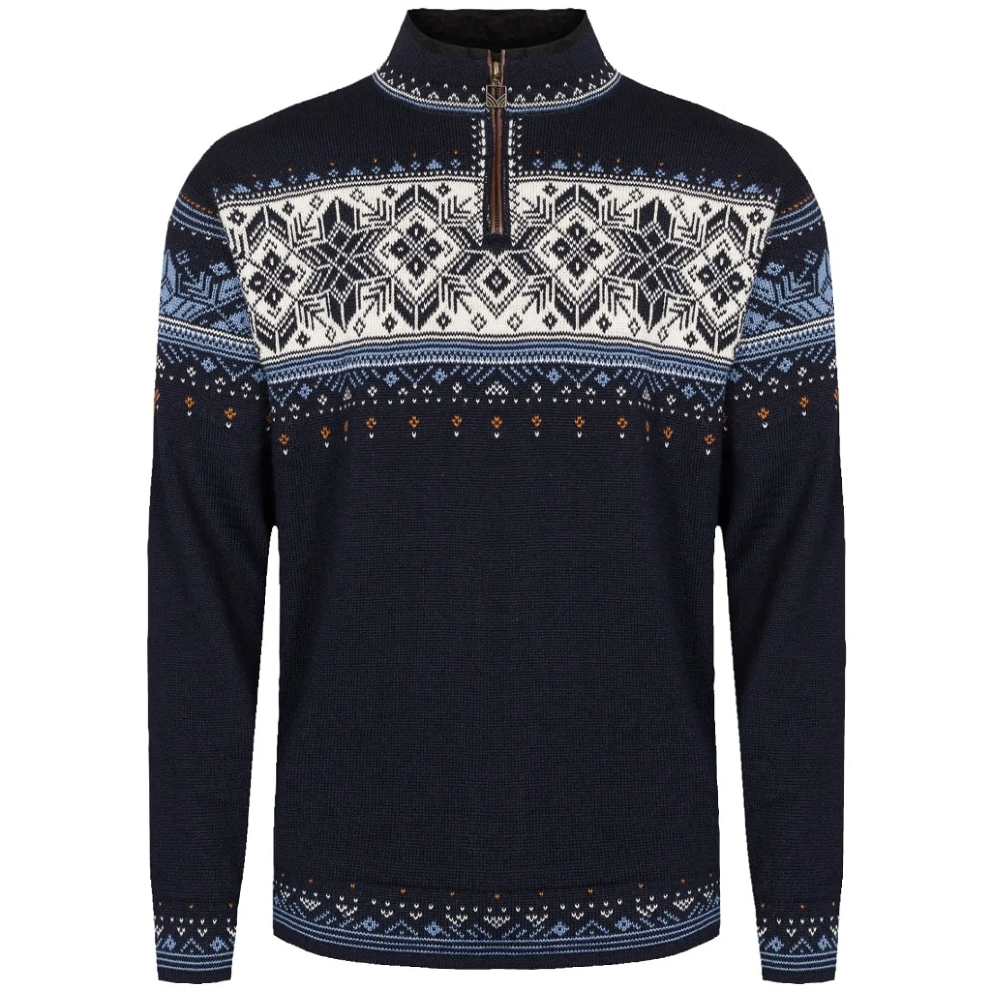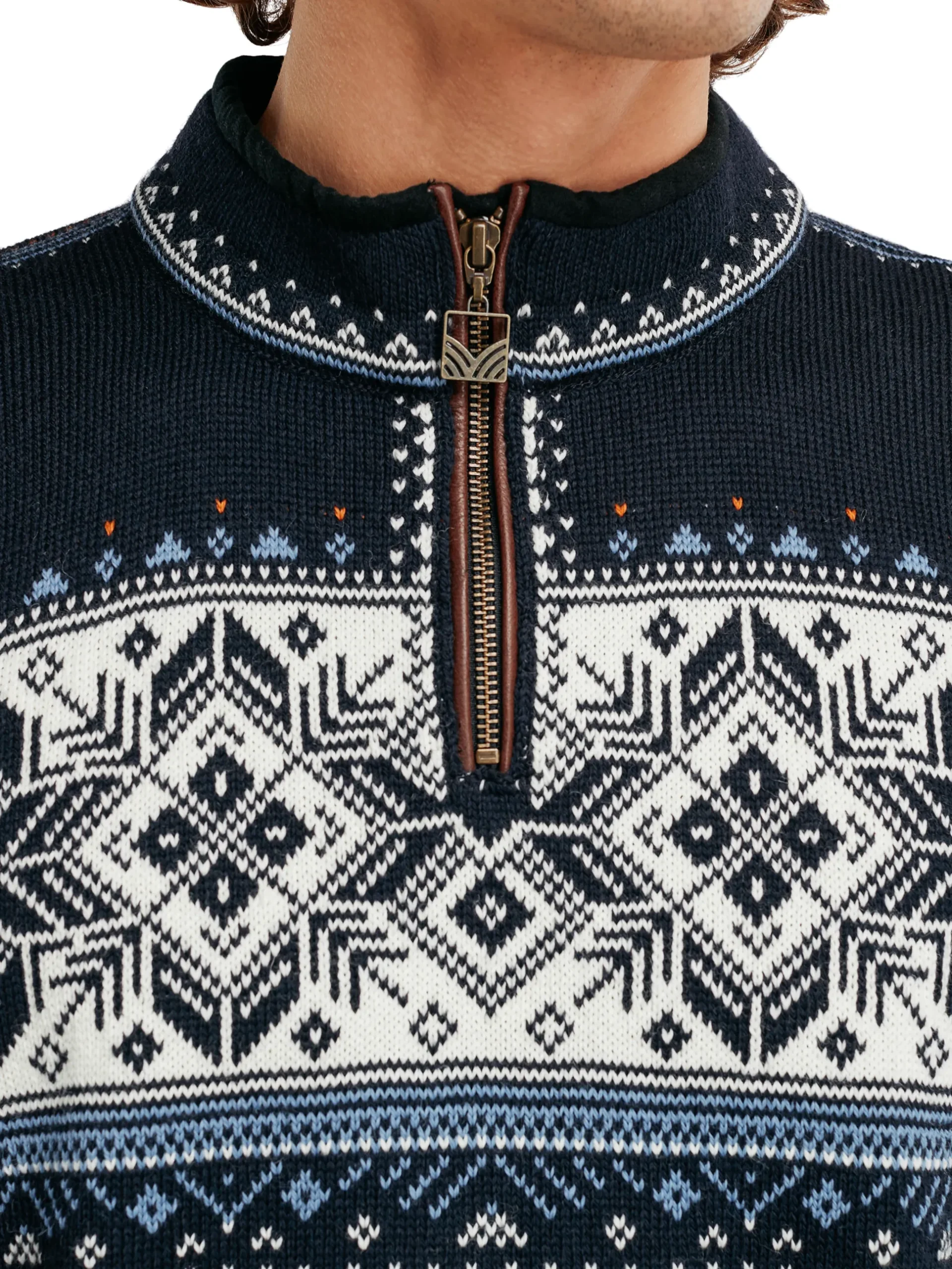 A Timeless Unisex Sweater Inspired By Traditional Norwegian Patterns, With Elk Leather Trim Along The Zipper. Made With 100% Lightweight Wool.