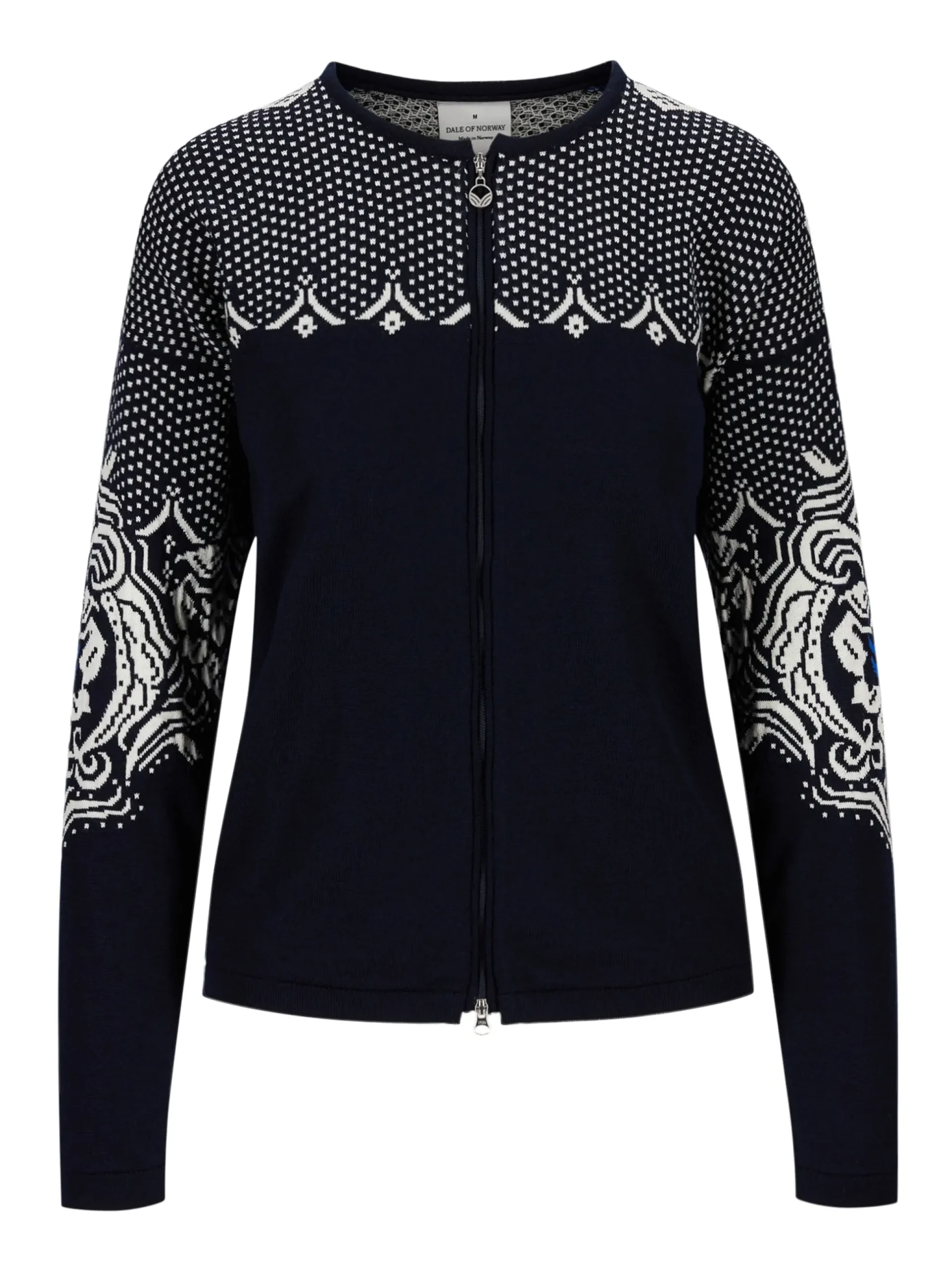 A Soft And Very Thin Wool Jacket In 100% Merino Wool, With A Roll Neck And Two-Way Zipper. The Jacket Has An Extensive Detailed Floral Pattern Based On The Old Dale Patterns, Combined With The Traditional Lice Pattern On The Shoulders.