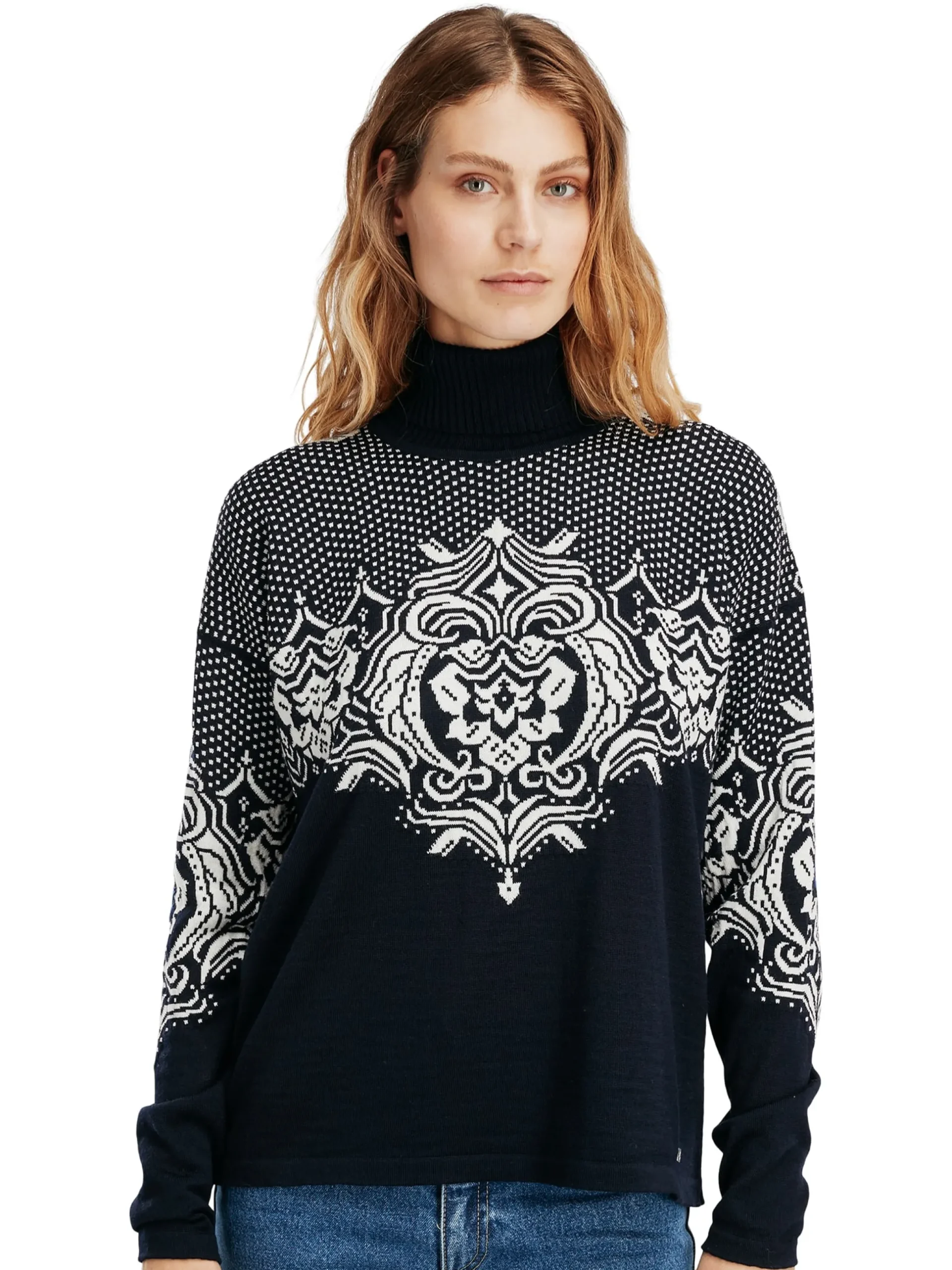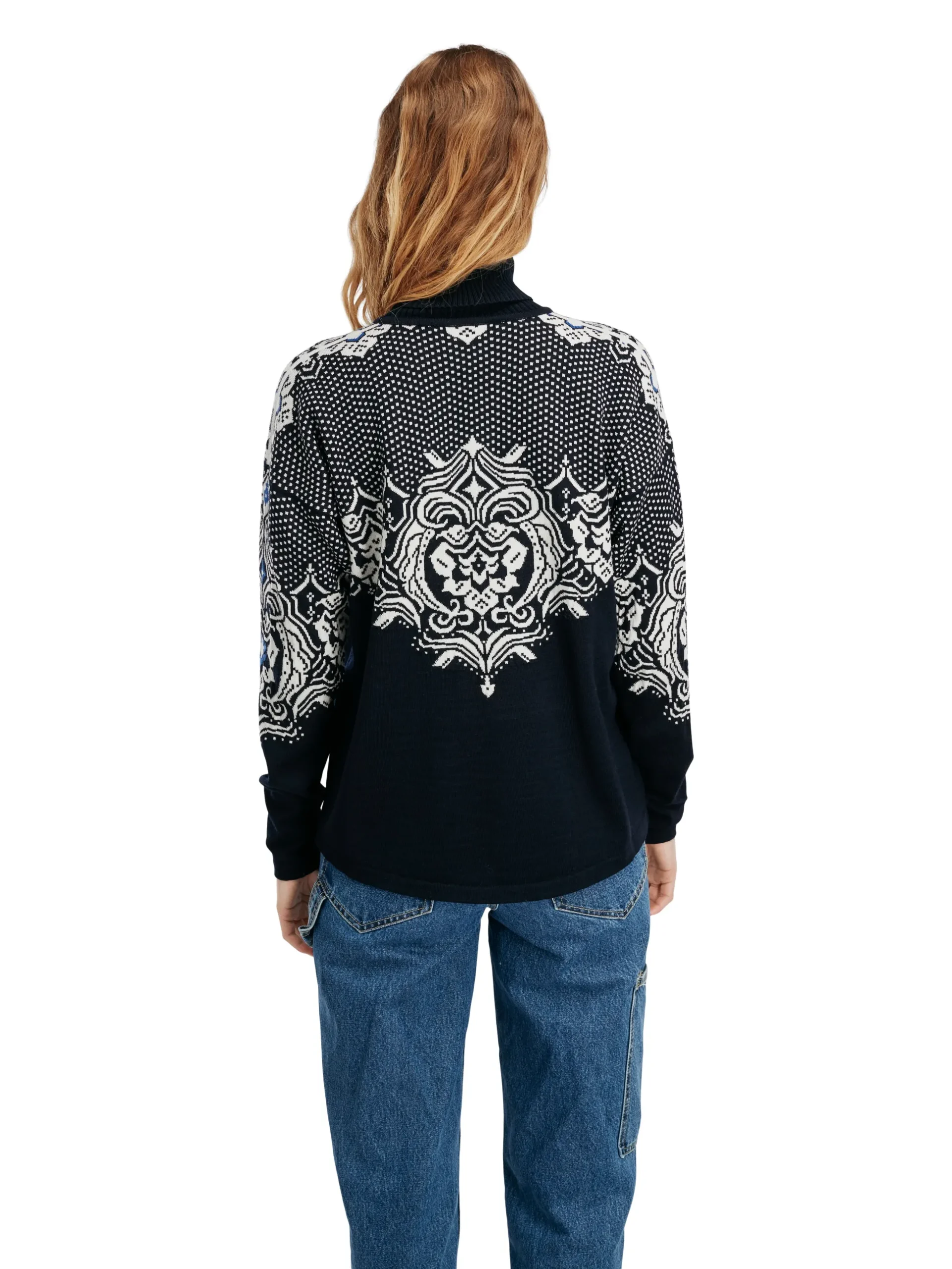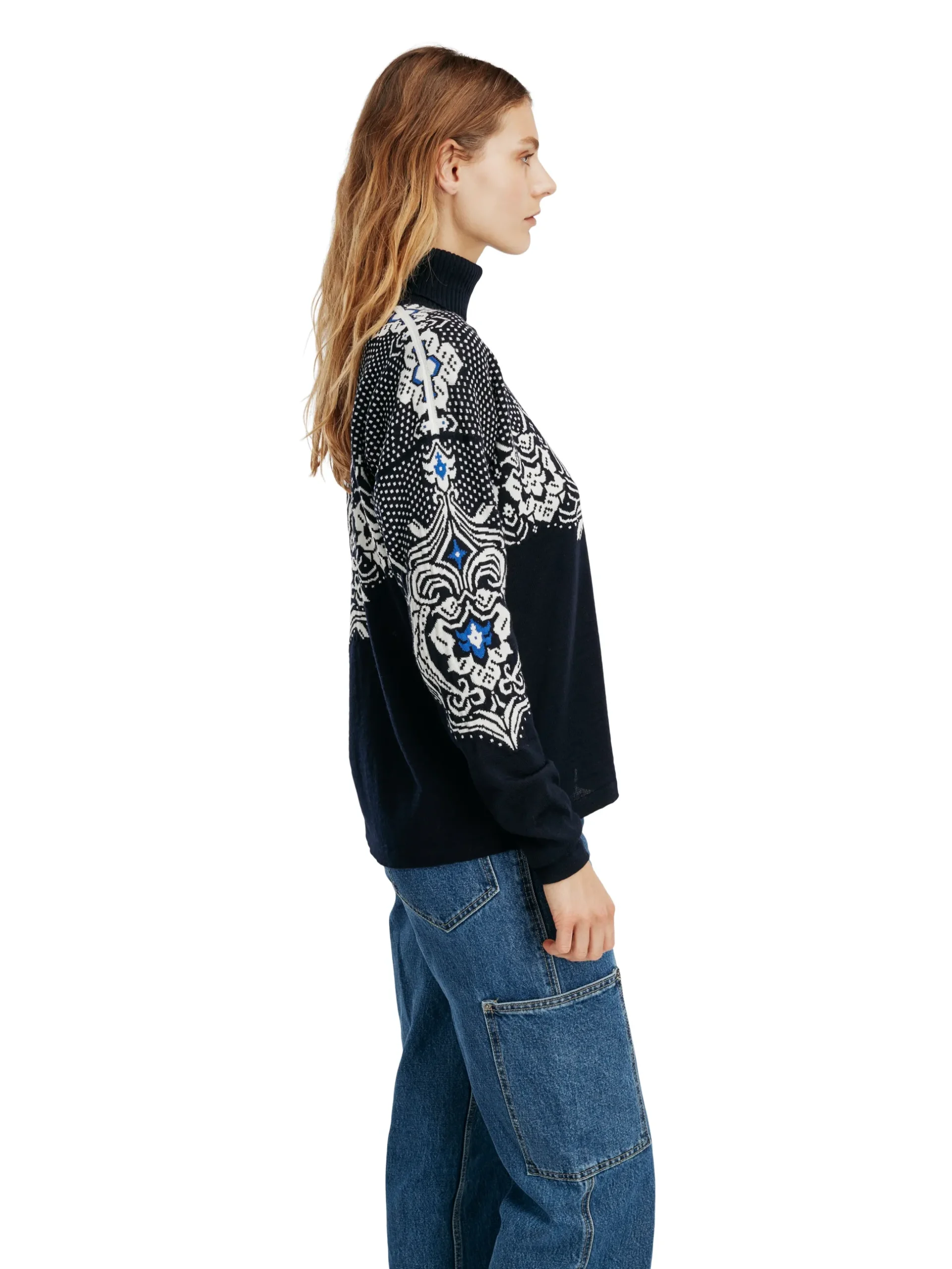 A Soft And Very Thin Wool Sweater In 100% Merino Wool, With A High Ribbed Neck. The Sweater Has An Extensive Detailed Floral Pattern Based On The Old Dale Patterns, Combined With Traditional Lice Pattern On The Shoulders. The Sweater Is Shorter In The Front Than The Back. The Wide Silhouette In Lightweight Merino Wool Makes It Easy To Tuck The Sweater Into The Pants For A More Casual Look.