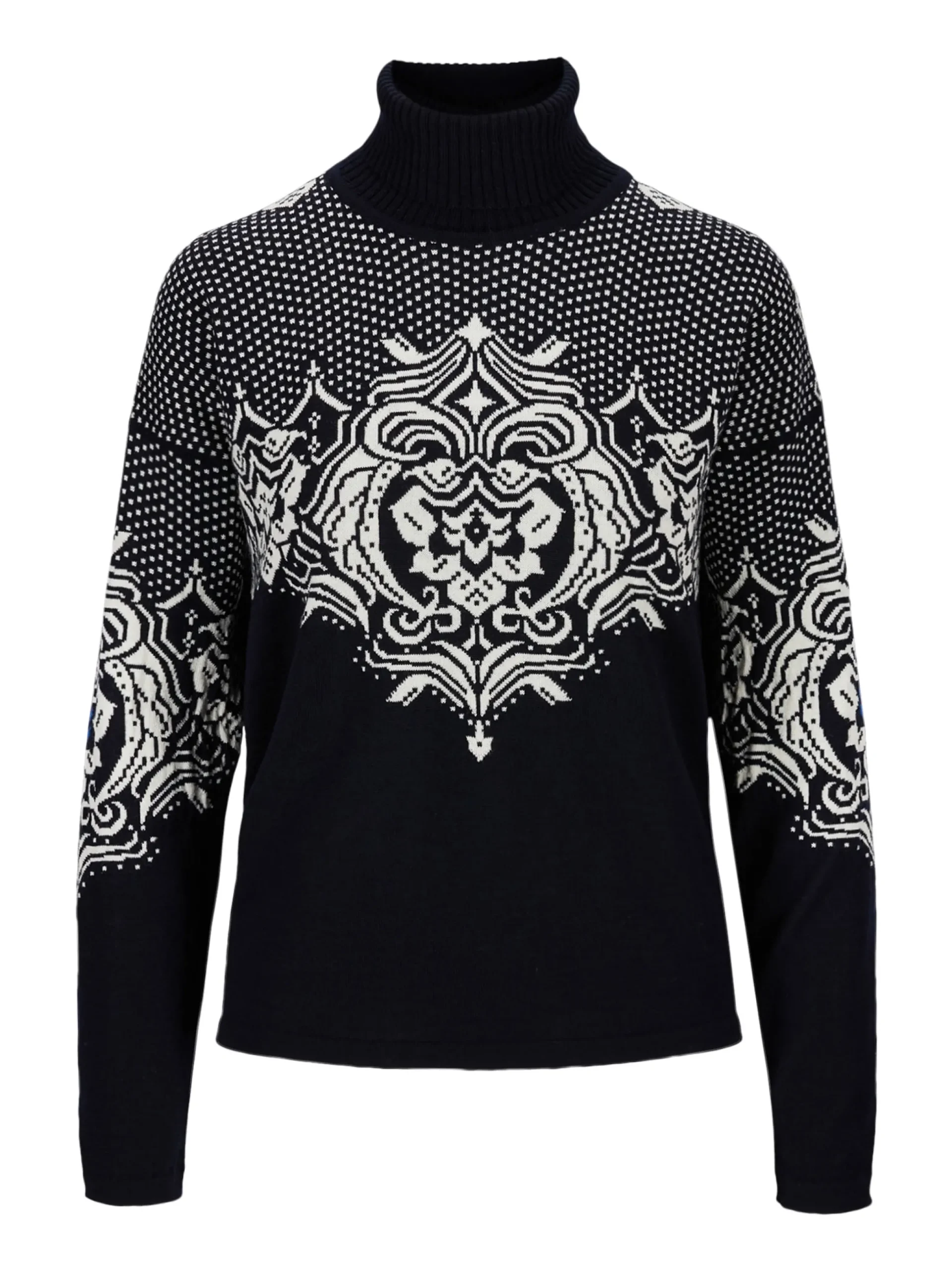 A Soft And Very Thin Wool Sweater In 100% Merino Wool, With A High Ribbed Neck. The Sweater Has An Extensive Detailed Floral Pattern Based On The Old Dale Patterns, Combined With Traditional Lice Pattern On The Shoulders. The Sweater Is Shorter In The Front Than The Back. The Wide Silhouette In Lightweight Merino Wool Makes It Easy To Tuck The Sweater Into The Pants For A More Casual Look.